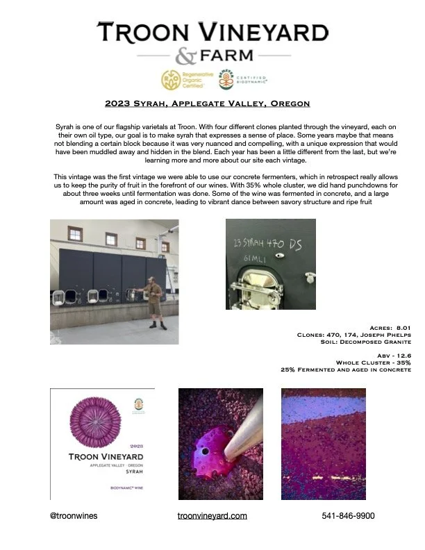 Our 2022 Syrah represents a bit of a turning point for Troon Vineyard. This wine is made up of approximately 50% of our older syrah vines (Tablas Creek clone), and roughly 50% of our new younger syrah vines (Joseph Phelps clone and clone 174). With our warm days and cool nights, the Applegate Valley is an ideal growing environment for syrah, and we take advantage of this fact by having four different clones of syrah planted across our almost one-hundred-acre site in three distinct soil types to showcase how well Syrah can capture that unique sense of place in the glass.